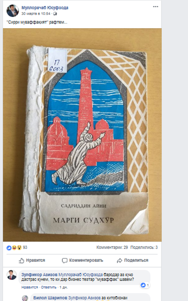 Пас аз он ки Бег Сабур, раиси Хадамоти алоқаи Тоҷикистон дар мусоҳибаи худ ба Радиои “Озодӣ” аз китобхонии худ тавсиф намуд, корбарони шабакаи иҷтимоии Фейсбук маъракаи “китобхонӣ”-ро роҳандозӣ намуданд. Онҳо акси китоби “Марги судхӯр”-и Садриддин Айниро дар саҳифаҳои худ нашр карда, навиштаанд, ки “асрори муваффақият дар тиҷоратро меомӯзанд”.