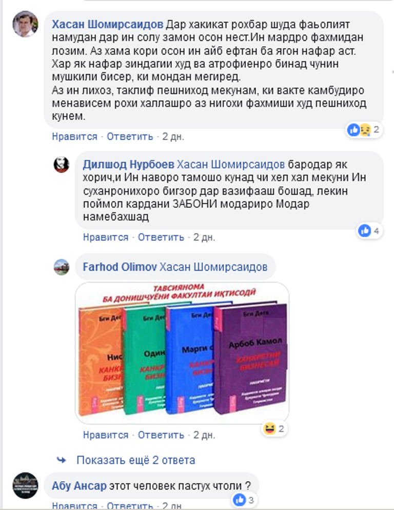 Ба ин монанд шарҳҳо дар саҳифаҳои Фейсбук садҳо аст. Ва иқдоми “даъват ба китобхонӣ” дар шабакаҳои интернетӣ ҳам идома дорад.