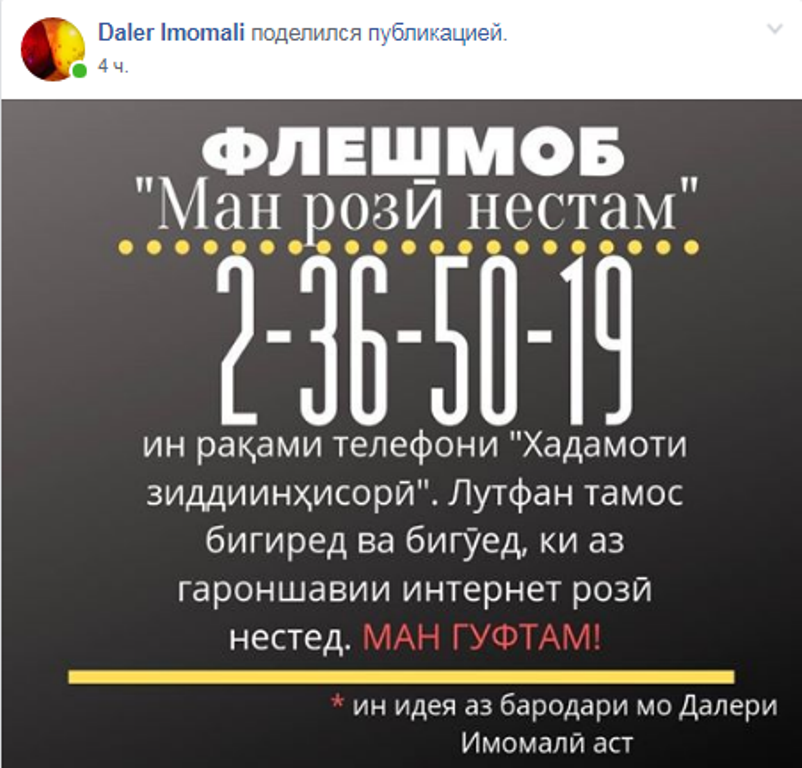 Далери Эмомалӣ, яке аз корбарони фаъоли шабакаи Фейсбук бо эълони “флэшмоб” рақамҳои телефони Хадамоти зиддинҳисориро гузошта, аз корбарони дигари Фейсбук хоҳиш намуд, ки ба ин ниҳод занг зада, норозигии худро аз баланд бардоштани нархи Интернет иброз доранд. Чанде аз корбарони дигари шабакаи Фейсбук ин пешниҳоди Далерро писандида, ба Хадамоти зиддиинҳисорӣ занг ҳам задаанд ва эътироз намудаанд. Аз ҷумла, Абдулазизи Восеъ навишт, ки чанде пеш ба ин ниҳод зада, норозигиашро баён намудааст.