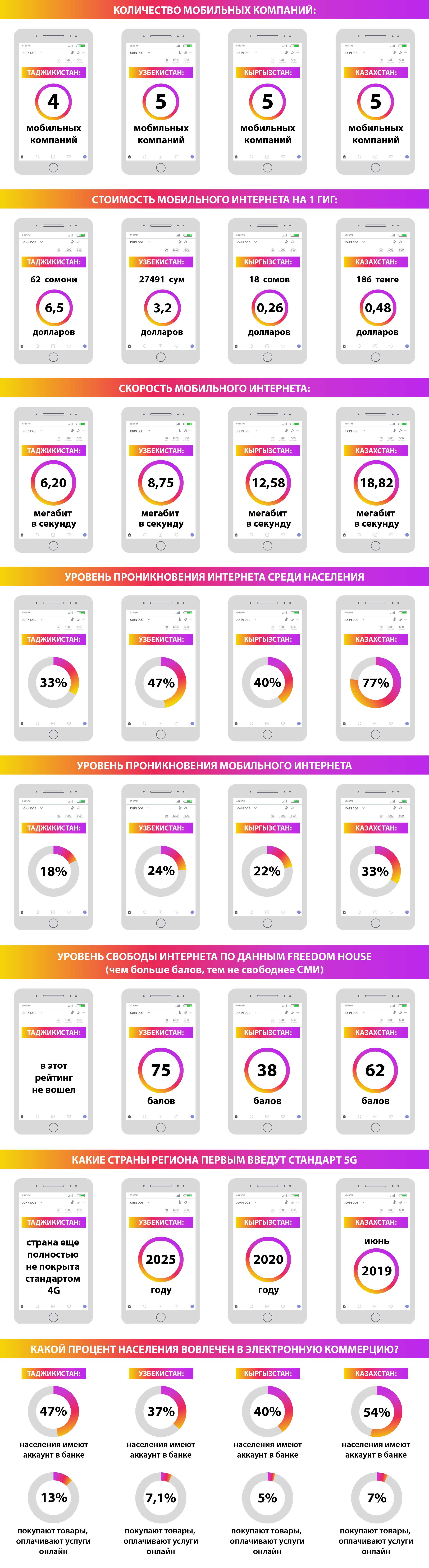 Дар бораи муқоисаи арзиш ва суръати интернети Тоҷикистон бо кишварҳои Осиёи Марказӣ инфографика таҳия намудем. Мутассифона, қариб аз рӯи ҳама нишондиҳандаҳо онҳо афзалият доранд.