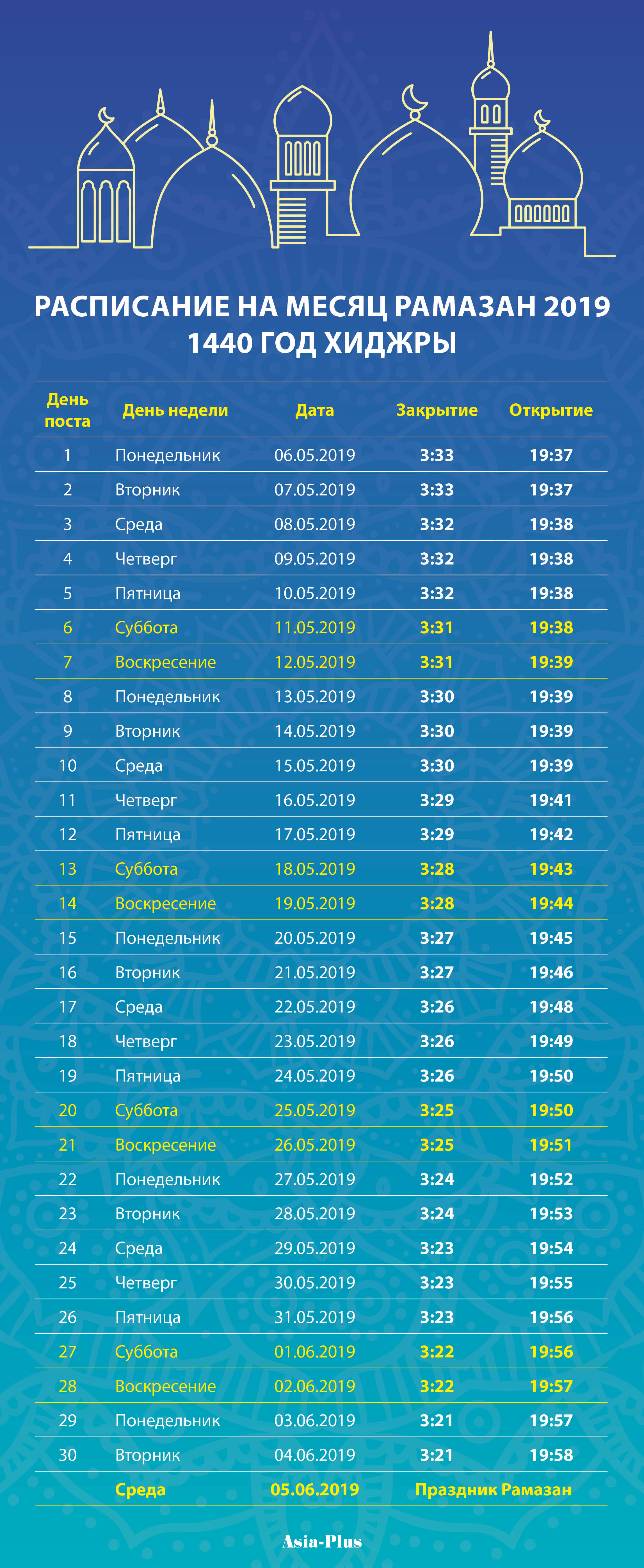 Бо қарори Раёсати Шӯрои уламои Маркази исломии Тоҷикистон моҳи шарифи Рамазон аз имрӯз, 6-уми май оғоз гардида, аввалин намози таровеҳ шоми санаи 5 май баргузор шуд. Шаби Лайлат-ул Қадри моҳи Рамазони имсола ба шаби 31 май – 1 июн рост меояд. Иди Рамазон санаи 5 уми июн ҷашн гирифта мешавад.