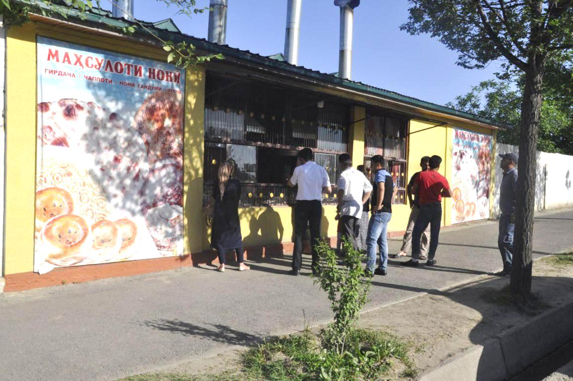 Дар назди нонвойхона мардум хеле зиёданд. Яке паси дигаре чӣ хостанашро мегӯяд ва аз дарун селофанеро сӯяш дароз мекунанд, ки дарунаш чаппатӣ ё гирдача, кулча ё орзуқ ва ё фатири равғанӣ аст. Мо ҳам дар навбат истодем. Акнун навбати мо расид.