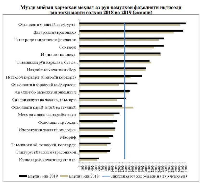 Музди меҳнати миёнаи моҳонаи номиналии моҳи март 1354 сомонӣ (145 доллар)-ро ташкил дод, ки нисбат ба моҳи марти соли 2018 ба миқдори 11,1% зиёдтар мебошад, хабар медиҳад Агентии омори назди президенти ҶТ.