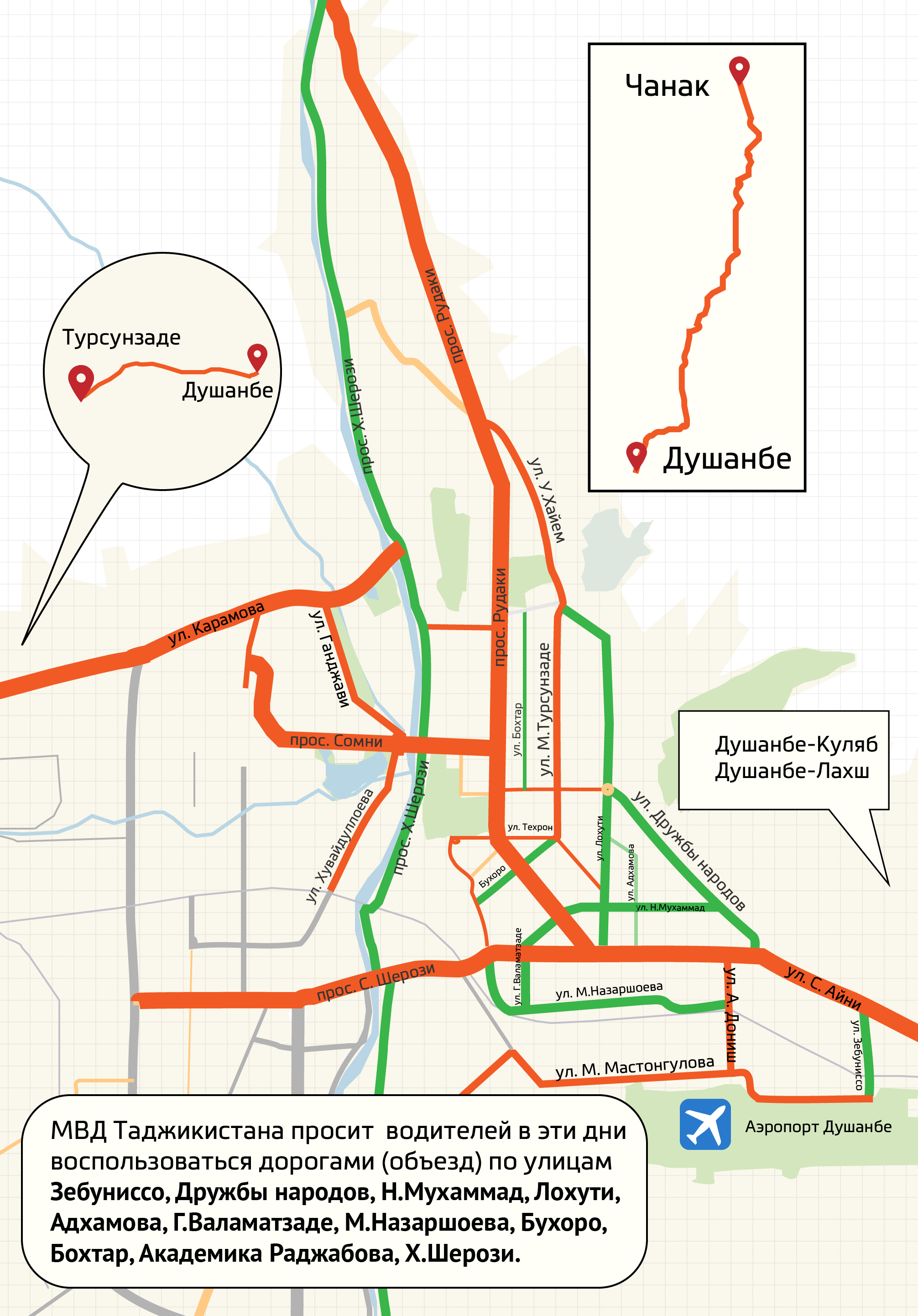 Дар харитаи мо бо ранги сурх роҳҳои кӯчаҳое нишон дода шудаанд, ки метавонанд баста шаванд. Бо ранги сабз бошад, роҳҳои ҳамшафати убур (гузаштан) аз онҳо.