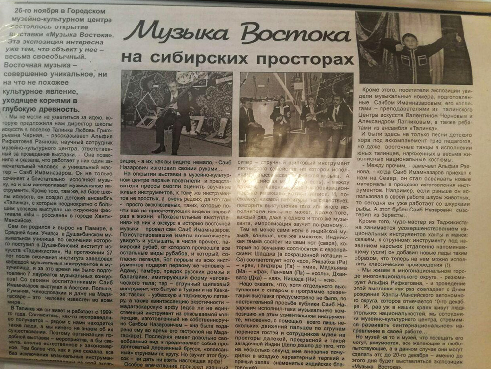 Аълочии фарҳанги Тоҷикистон, оҳангсозу навозанда ва дирижери касбӣ Соҳибназар Имомназаров дар солҳои ҷанги шаҳрвандӣ маҷбур шуд, ки бо аҳли оилааш тарки ҷумҳурӣ кунад. Ӯ ба хотири ҳифзи бехатарии хонавода ва таъмини рӯзгор ба шаҳри Нягани вилояти Ханти-Мансийски Русия сафар кард.