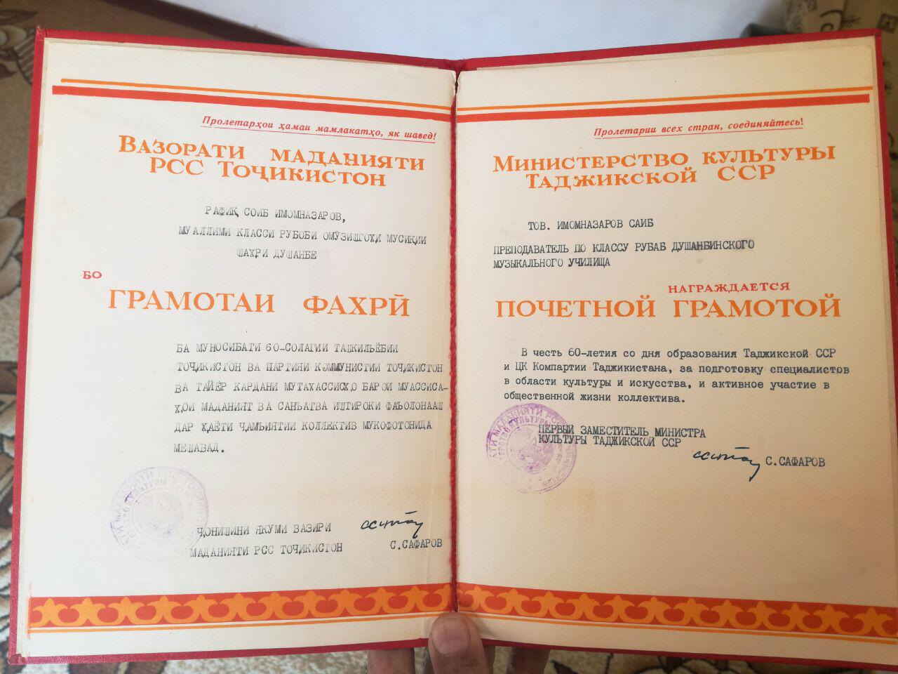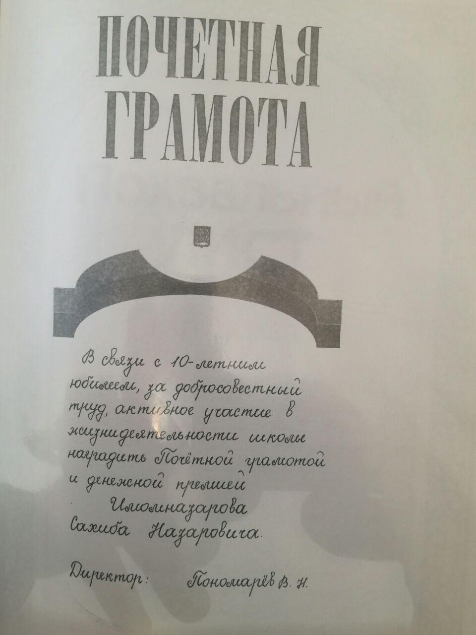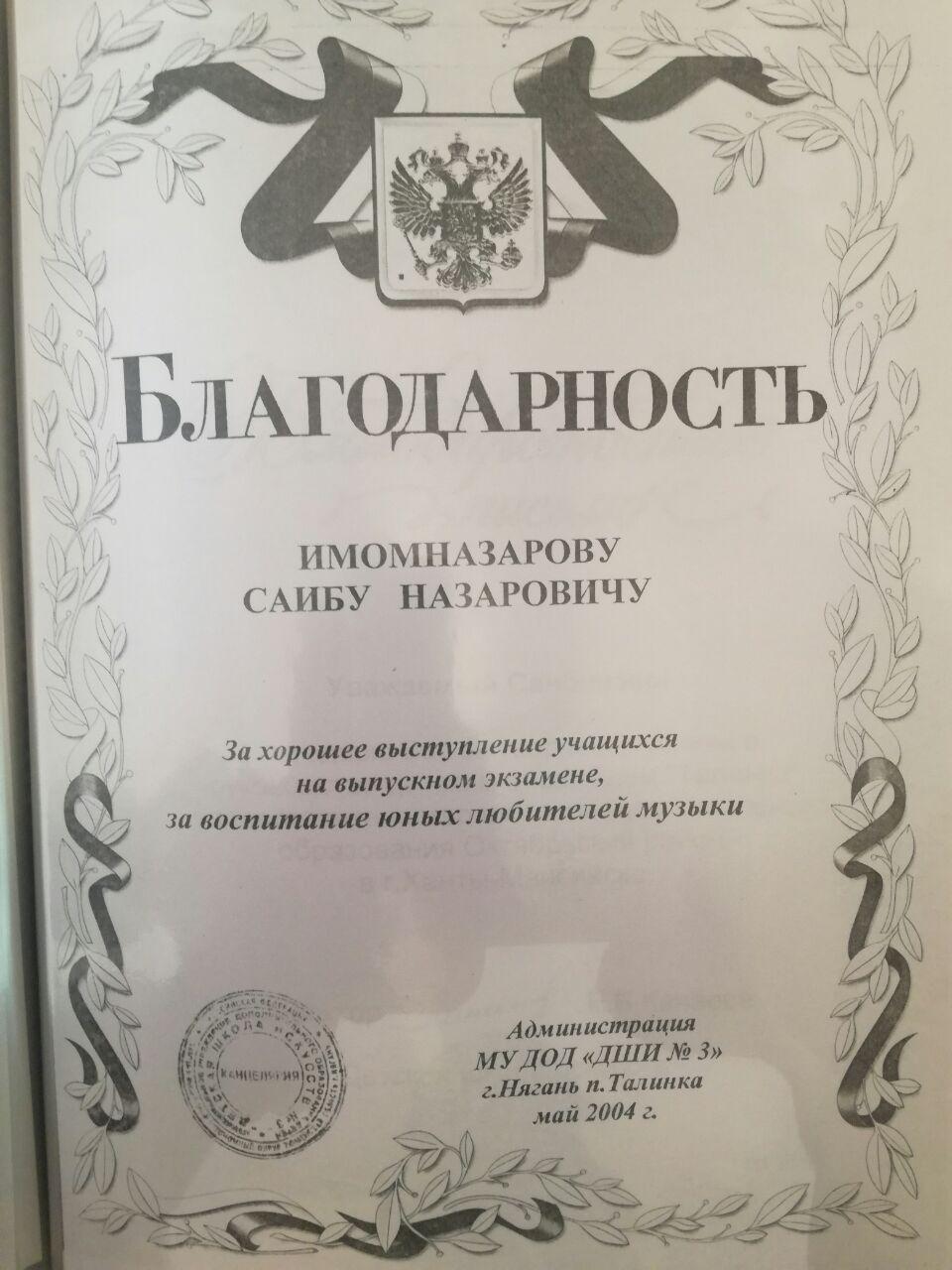 “Вақте бори аввал ба Русия кӯчидем, албатта, шаҳрвандии ин кишварро надоштем. Агарчи завҷаам рус аст, вале шаҳрвандии Русияро ба ҳар дуямон худам гирифтам. Яъне аввал маро як сол аз рӯйи шартнома ба муҳлати озмоишӣ ба кор гирифтанд. Нахуст баъзе ҳамкорон бо назари шубҳа нигоҳ карданд, чун рус набудам. Аммо бо гузашти замон сазовори эҳтироми атрофиён шудам ва маро мудири кафедраи мактаби мусиқии шаҳри Няган таъйин карданд”, – нақл мекунад Имомназаров.