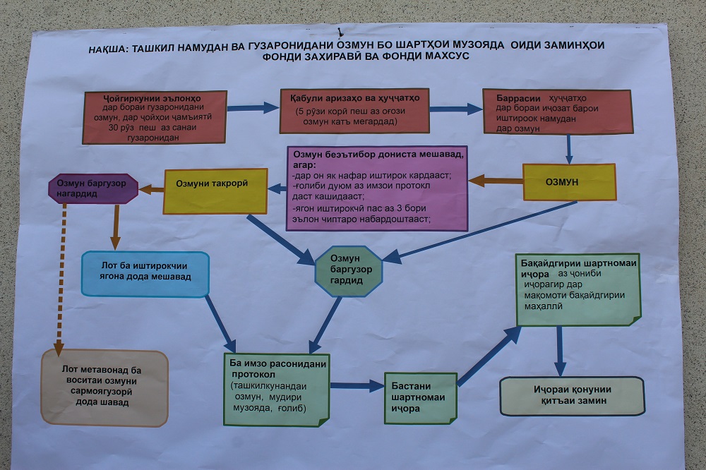 – Ин гуруҳи корӣ заминҳои фонди захиравиро муайян карда харитаи онро тартиб доданд. Дар харита заминҳоро ба категория ҷудо карда, онро бо рангҳои гуногун ишорагузорӣ карданд. Масалан, ранги сабз категорияи заминҳоест, ки корами обӣ буда, фоидаоваранд. Ҳуқуқи истифодаи муваққатии ин заминҳо дар давоми панҷ соли оянда тариқи музояда ба иҷора дода хоҳанд шуд, – гуфт хонум Ч. Арапова.