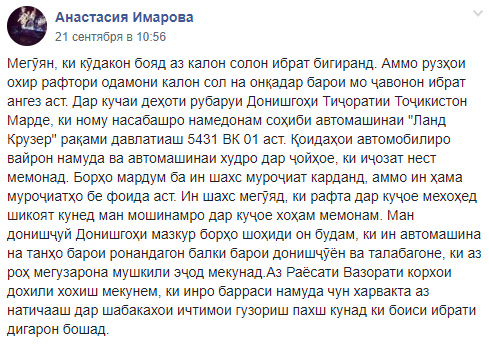 Як сокини пойтахт бо нашри матлаб дар Facebook аз рафтори ношоям ва таваққуфи нодурусти ронандаи автомашинаи тамғаи “Тайота-Лендкрузер”, рақами қайди давлатиаш 5438 ВК 01 дар кӯчаи А.Деҳотӣ шикоят кардааст.