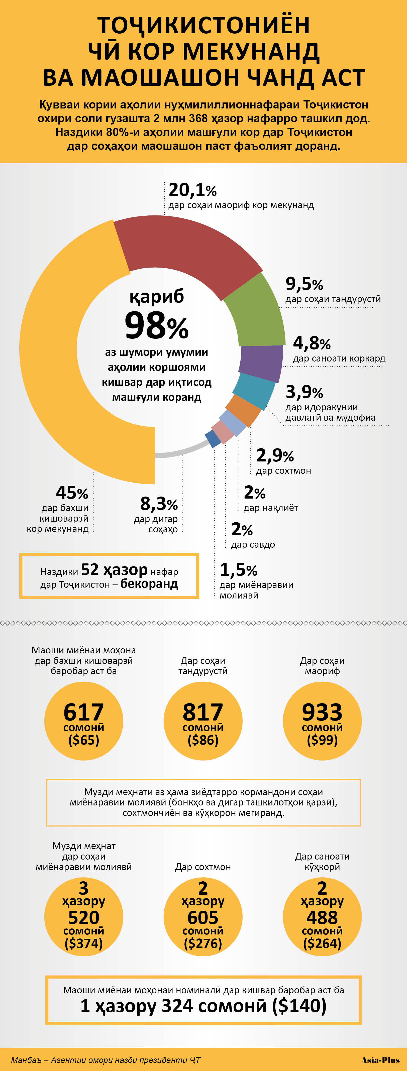 “Умуман, дар нимсолаи аввал истеъмоли картошка ба ҳисоби миёна сари ҳар нафар 21,1 кило, сабзавоту полезиҳо – 52,2, шир ва маҳсулоти ширӣ – 36,8, гӯшт ва маҳсулоти гӯштӣ – 6,6, равғани рустанӣ – 8,2 кило, тухм – 50 дона, қанду шакар ва маснуоти қаннодӣ – 7,6, мева – 14,7 килоро ташкил кардааст”, – қайд мешавад дар маҷмӯа.