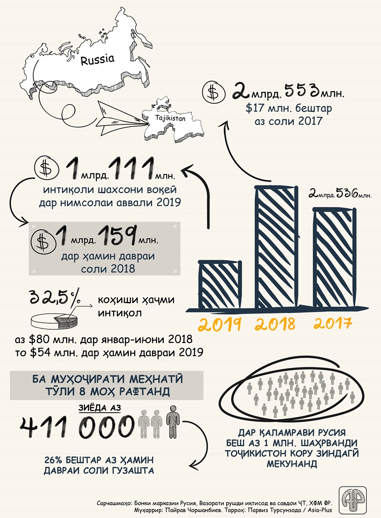 Ҳаҷми интиқоли пули шахсони воқеӣ аз Русия ба Тоҷикистон тӯли 6 моҳи соли равон нисбат ба ҳамин давраи соли гузашта 4,2% коҳиш ёфтааст.