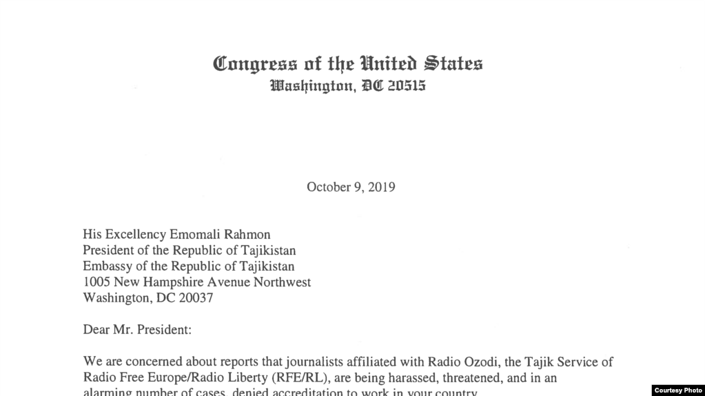 Дар ин нома, ки аз тарафи намояндаи демократҳо Адам.Б.Счифф (Adam B. Schiff) ва ҷумҳурихоҳон Стив Чабот (Steve Chabot) имзо шудааст, гуфта мешавад, ки Конгресси Амрико, ҳамчун сармоягузори Радиои Аврупои Озод/Радиои Озодӣ, ки ҳадафаш рушди матбуоти озод ва мустақил аст, аз он нигарон аст, ки идома ёфтани чунин вазъият, "эҳтимолан ба муносибатҳои Амрико ва Тоҷикистон осеб расонад ва ба обрӯи Тоҷикистон латма занад".