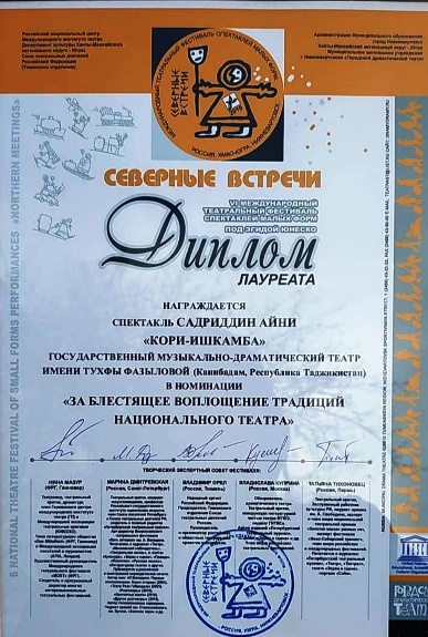Намоиши “Қорӣ-Ишкамба”-и театри давлатии драмаи мусиқии шаҳри Конибодом ба номи Туҳфа Фозилова дар VI-умин Ҷашнвораи байнулмилалии театрии “Северные встречи” сазовори ҷоизаи “Беҳтарин инъикоси анъанаҳои театри миллӣ” гардид.