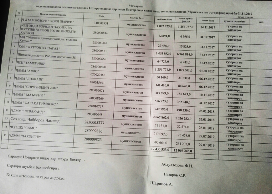 Тавре аз нозироти андози шаҳри Бохтар ба “Азия-Плюс” хабар доданд, ба ин рӯйхат ширкату корхонаҳое ворид шудаанд, ки аз фаъолият бозмонда ва ё муфлис гардидаанд.