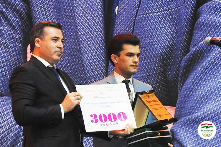 Медали тиллои Чемпионати Осиё (4-7.07.2019, Нурсултон, Қазоқистон) ва медали биринҷии Чемпионати ҷаҳон (29.07-4.08.2019, Софиа, Булғория) миёни наврасон дар вазни -55кг, (25000+18750) 43750 сомонӣ (8750 сомонӣ ба мураббӣ)