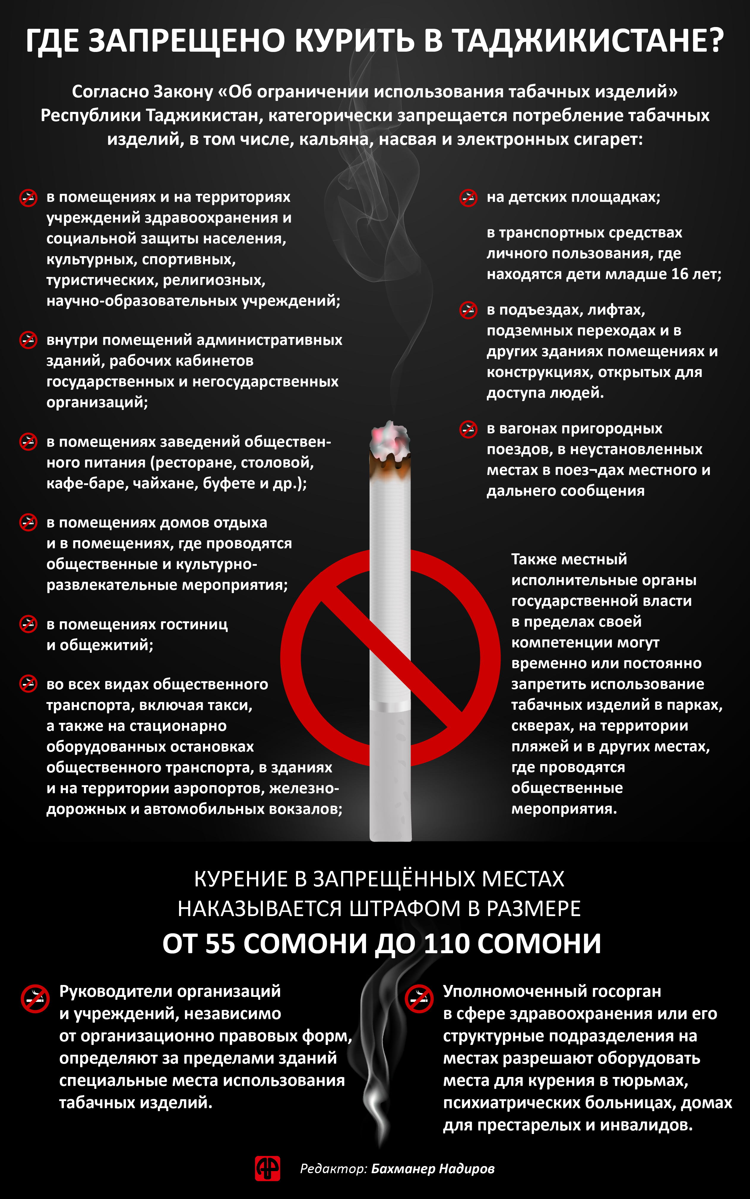 Ин ҷо дастуре бароятон таҳия шудааст, ки дар он пиромуни дар куҷо манъ будани тамокукашӣ дар Тоҷикистон ва ҷазои пешбинишуда барои он маълумот дода мешавад.