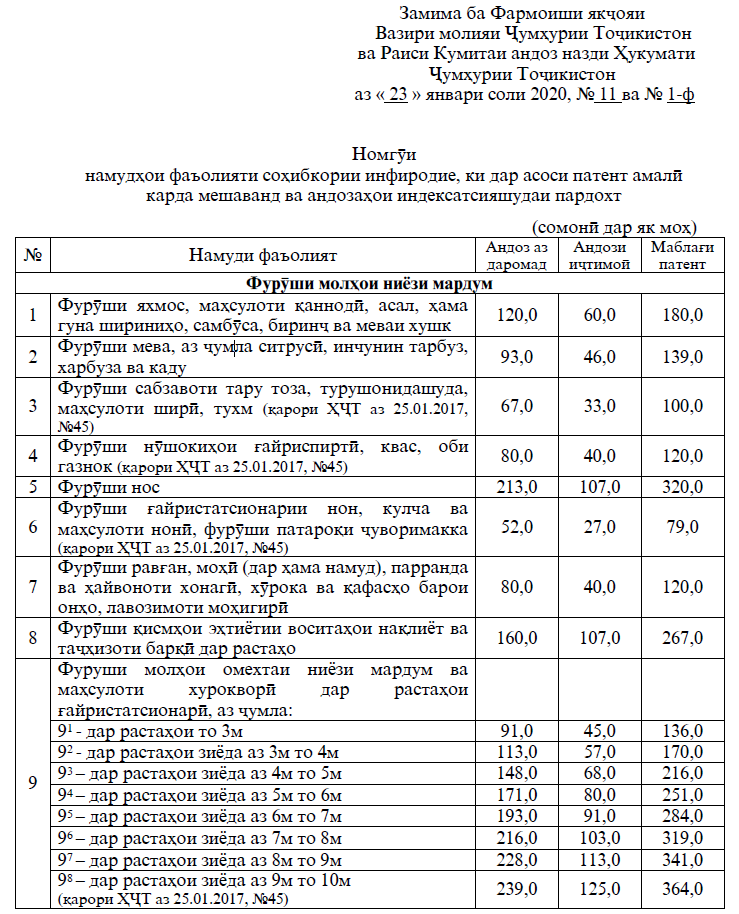 Дар фармоиш гуфта мешавад, андозаи пардохт ҷиҳати амалӣ намудани фаъолияти соҳибкорӣ тибқи патент (андози даромад ва андози иҷтимоӣ) дар соли 2020 бо назардошти сатҳи таваррум аз рӯйи натиҷаи соли 2019 дар ҳаҷми 8,0% индексатсия карда шавад.