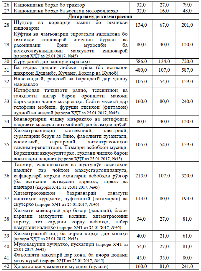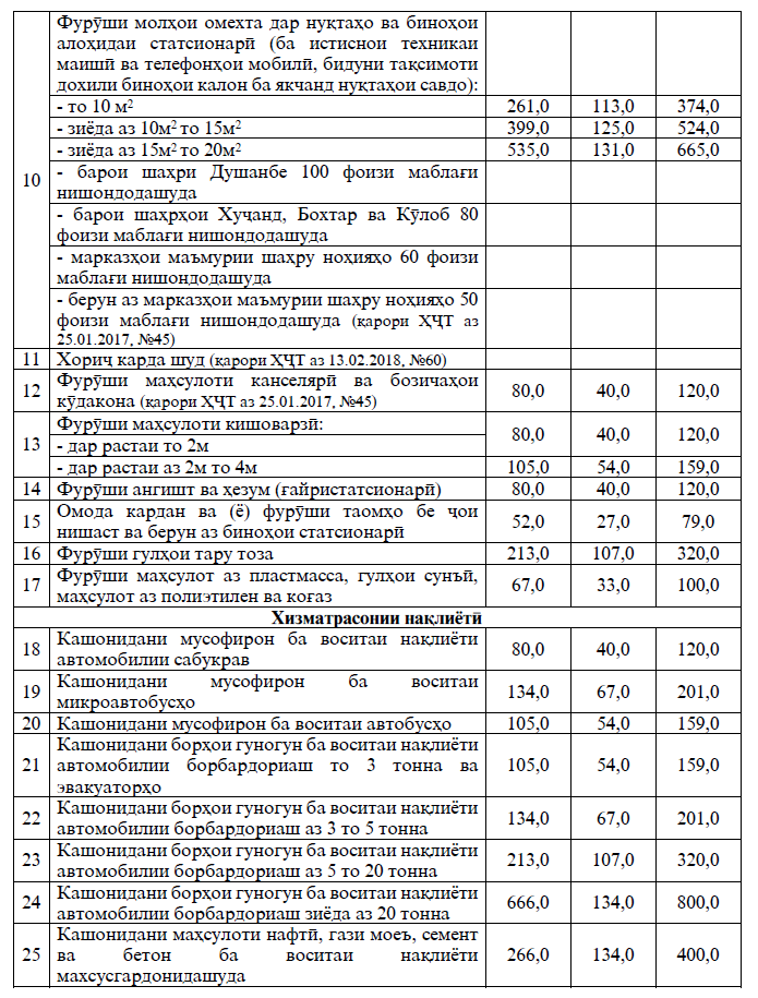 Андозаи маблағи пардохти моҳона барои фурӯши гулҳои тару тоза 320 сомонӣ (ба ивази 296 сомонии ҳозира), барои ҳоҷатхонаи ҷамъиятии пулакӣ – 241 сомонӣ (қаблан – 223 сомонӣ) ва фаъолияти масҳгарӣ дар хона – 80 сомонӣ (қаблан – 74 сомонӣ) муқаррар шудааст.