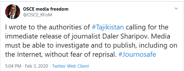 Ҳамчунин намояндаи Созмони Амнияту Ҳамкорӣ дар Аврупо (САҲА) оид ба масоили озодии ВАО Ҳарлем Дезир шоми 3-юми феврал бо нашри як баёния аз ҳукуматдорони Тоҷикистон дархости озодии рӯзноманигори ҳабсшударо карда буд: “Ман ба мақомоти Тоҷикистон навиштам, ки фавран журналист Далер Шарифовро озод кунанд. Воситаҳои ахбори омма бояд бидуни тарси интиқом имкони таҳқиқу нашр, аз ҷумла, дар Интернет дошта бошанд”.