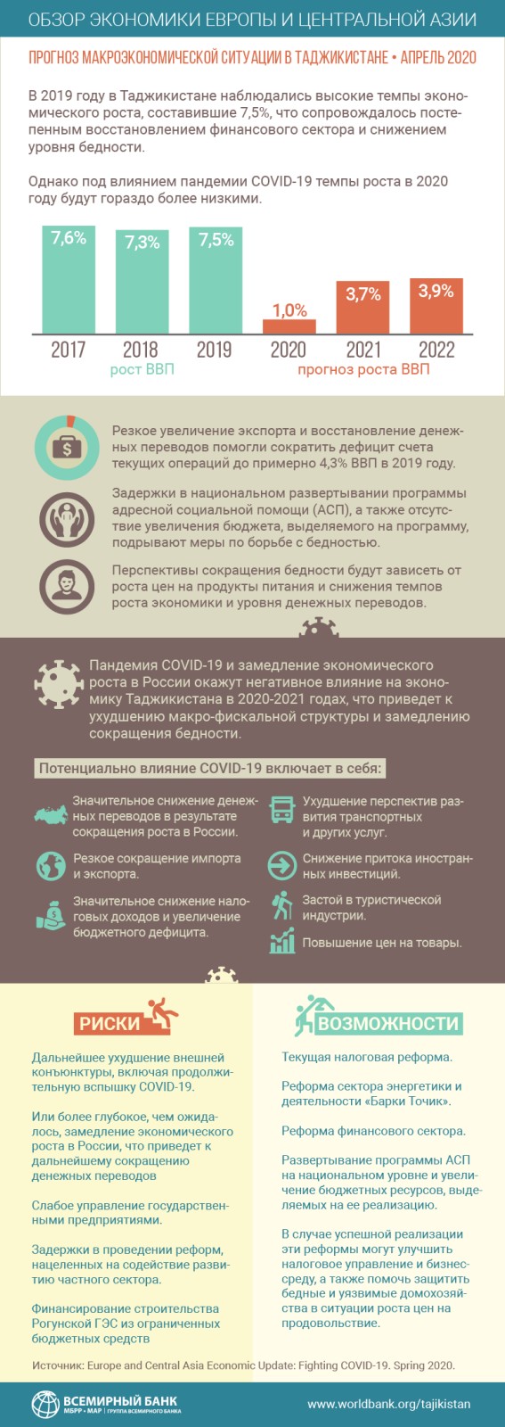 “Хуруҷи COVID-19 ва хавфҳо барои рушд дар Русия – сарчашмаи асосии интиқоли пули муҳоҷирон ба бадшавии назарраси сохтори макромолиявӣ боис гардид”, – гуфта мешавад дар Пешгӯйии Бонки ҷаҳонӣ дар бораи вазъи макроиқтисодӣ дар Тоҷикистон, ки рӯзи 27-уми апрел интишор шуд.