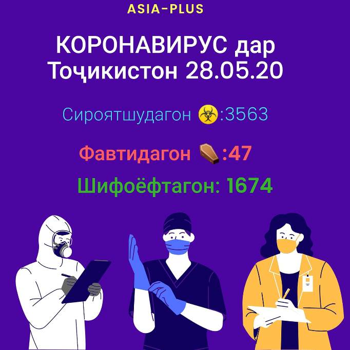 Шумори умумии сироятёфтагон аз COVID-19 дар Тоҷикистон то шоми рӯзи 28 май ба 3 ҳазору 563 нафар расид: давоми як шабонарӯз 139 (шабонарӯзи гузашта – 158 ҳолат) ҳолати нави сироятёбӣ ба қайд гирифта шуд.