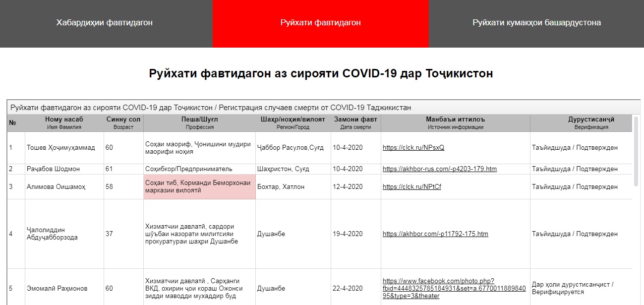 Ба ҳолати 17 июн шумораи фавтидагон аз коронавирус дар ин сомона 433 нафарро ташкил медиҳад. Ҳамчунин дар рӯйхати маълумоти нопурраи ин сомона ному насаби 29 бемор оварда шудааст.