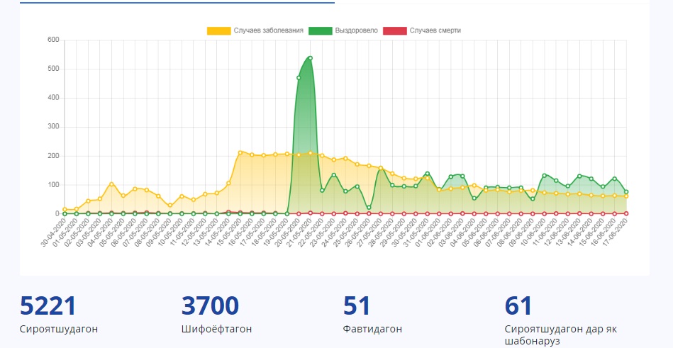 Омори расмӣ мегӯяд, ки то 17 июн дар кишвар 5 ҳазору 221 гирифторони коронавирус ба қайд гирифта шуда аз онҳо 3 ҳазору 700 нафарашон шифо ёфта, 51 нафар аз ин беморӣ фавтидаанд.