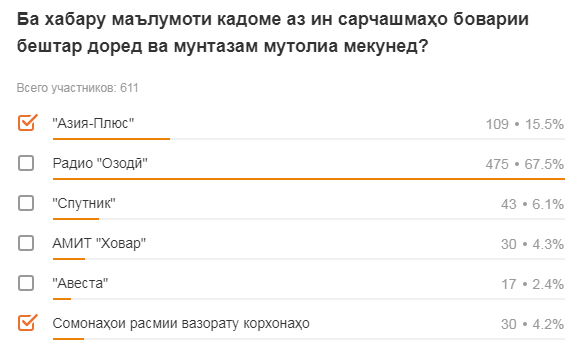 Дар назарпурсии Facebook 558 корбар иштирок намуданд ва бештари онҳо (313 кас) ба тарафдории Оҷонсии иттилоотии “Asia-Plus” овоз доданд. Ҳамин тавр ба тарафдории