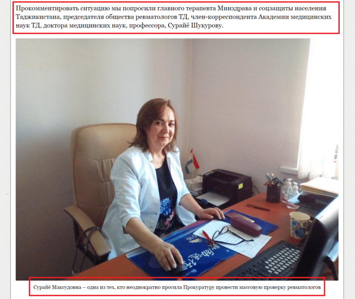 21-уми августи соли ҷорӣ дар сомонаи рамзии «Медуза» маводе таҳти унвони «Лечение суставов дорогими пустышками: ревматологи 12 лет обманывают пациентов по всему Таджикистану» нашр гардид (бойгонӣ).