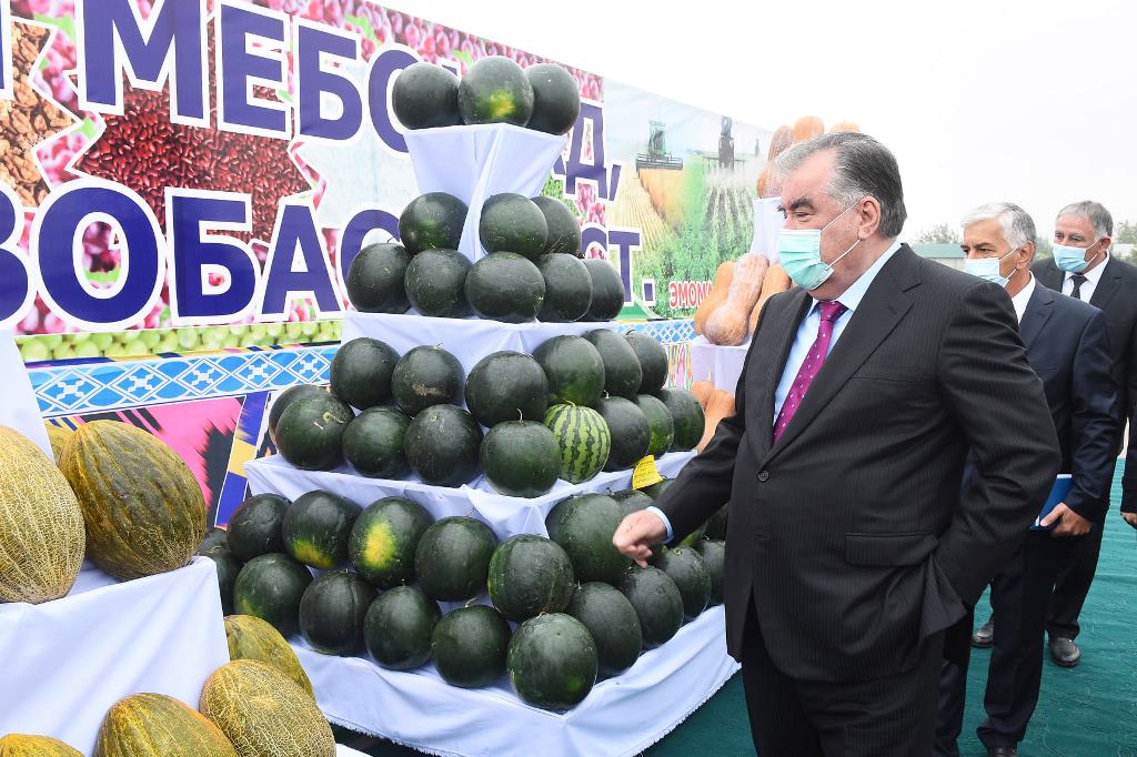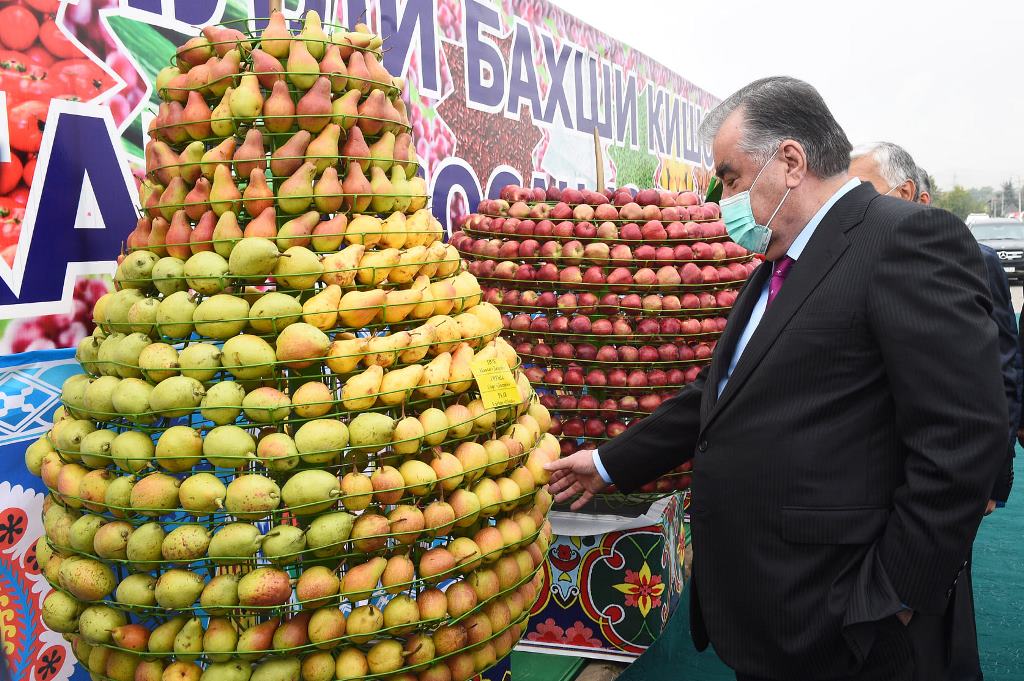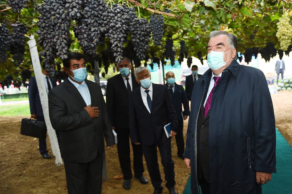 Дар идома Эмомалӣ Раҳмон ба ҶДММ “Кишоварз” ташриф оварда, бо нашъунамои ниҳоли дарахтони себ дар боғи навбунёди интенсивӣ шинос шуд ва ба ҷамъоварии ангур оғоз бахшид.