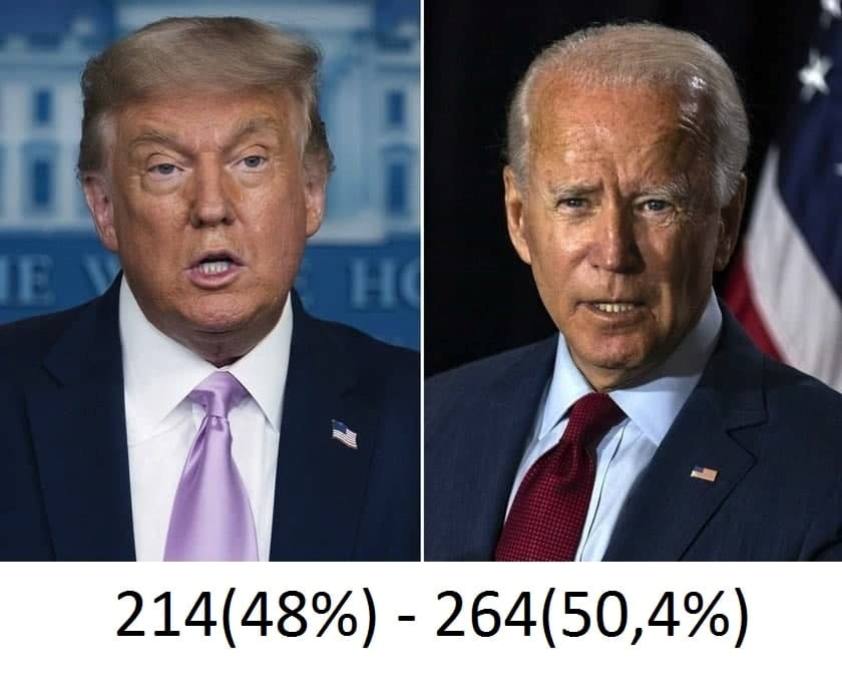 Шумориши раъй пас аз анҷоми интихоботи президентии Иёлоти Муттаҳидаи Амрико идома дорад ва то кунун номзади демкоратҳо Ҷо Байден бо 264 раъй дар пеш аст. Ҳоло Трамп 214 раъй дорад ва тибқи низоми интихоботи амрико касе, ки баъди шумориши коллеҷи интихоботи 270 раъй ба даст овард, пирӯзи интихобот эълон мешавад.