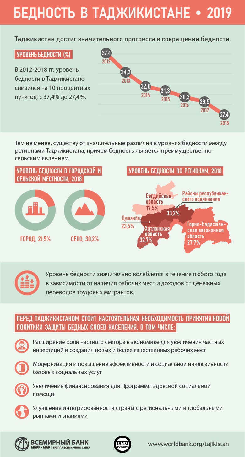 Тибқи маълумоти ахири Бонки ҷаҳонӣ, на камтар аз 12% аҳолии Тоҷикистон, яъне зиёда аз 1,1 млн кас аз 9,4 млн нафар аҳолии кишвар дар вазъи камбизоатии ҳадди пасттарин қарор доранд.