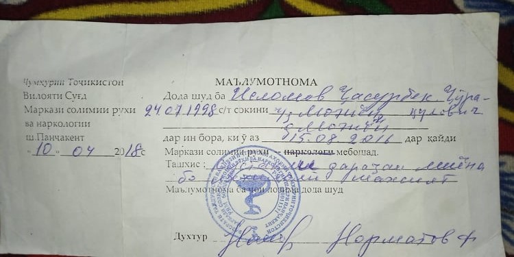 Ин ҷавон ба гуфтаи падараш, айни замон дар Беморхонаи ҷумҳуриявии бемориҳои равонии ноҳияи Рӯдакӣ, маъруф ба “Кӯктош” бистарӣ мебошад.