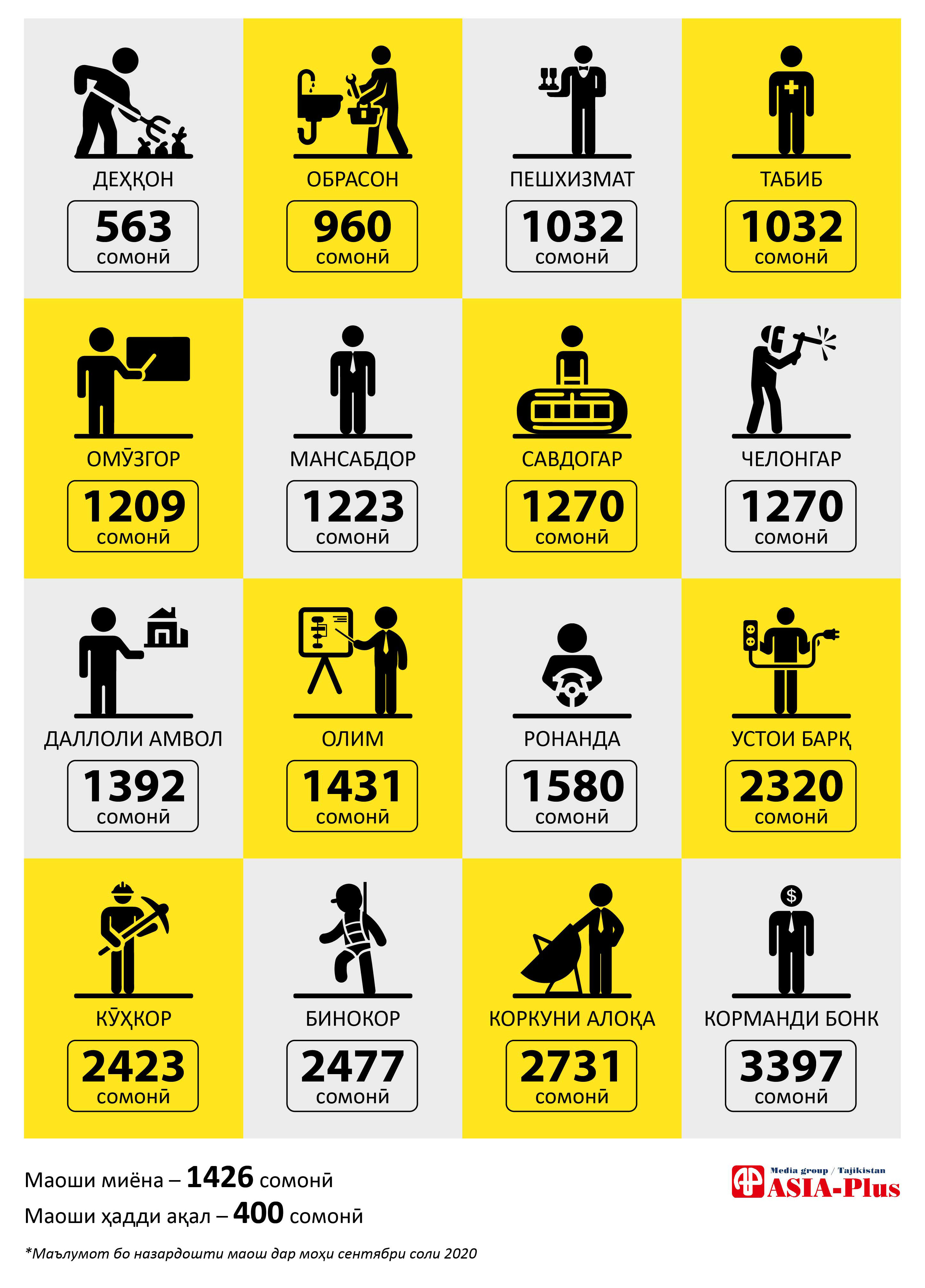 Дар як тасвир бароятон музди меҳнати миёнаи моҳонаи ҳадди ақал (номиналӣ)-ро барои намояндагони касбу кори гуногун пешкаш мекунем.