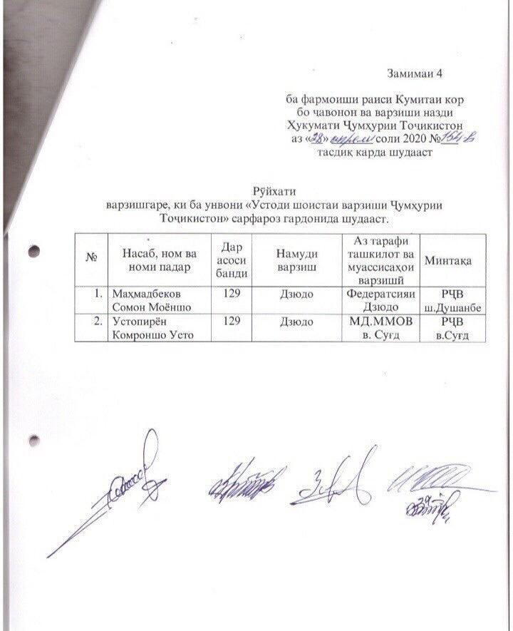 Комроншоҳ Устопириён ва Сомон Маҳмадбеков ду ҷудокори пуровозаи тоҷик унвони "Устоди шоистаи варзиши Ҷумҳурии Тоҷикистон"-ро соҳиб шудаанд. Ин унвон аз сӯйи Кумитаи ҷавонон ва варзиш ба ин ду паҳлавони хушном тақдим шудааст.