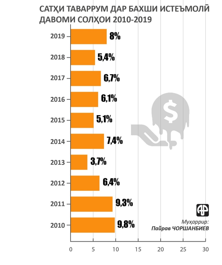 Сатҳи бештар баландтар тайи даҳсолаи ахир соли 2011 ба қайд гирифта шуда буд, ки он замон нархҳо ба молу маҳсулот ва тарифҳои хизматрасонии пулакӣ ба андозаи 9,3% боло рафта буданд.