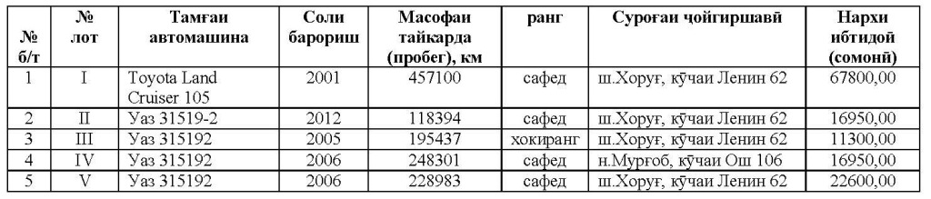 Автомашинаҳо аз рӯи принсипи “чи гуна аст ва дар куҷо” ва бе ягон кафолат аз тарафи БҶИИМК фурӯхта мешаванд.