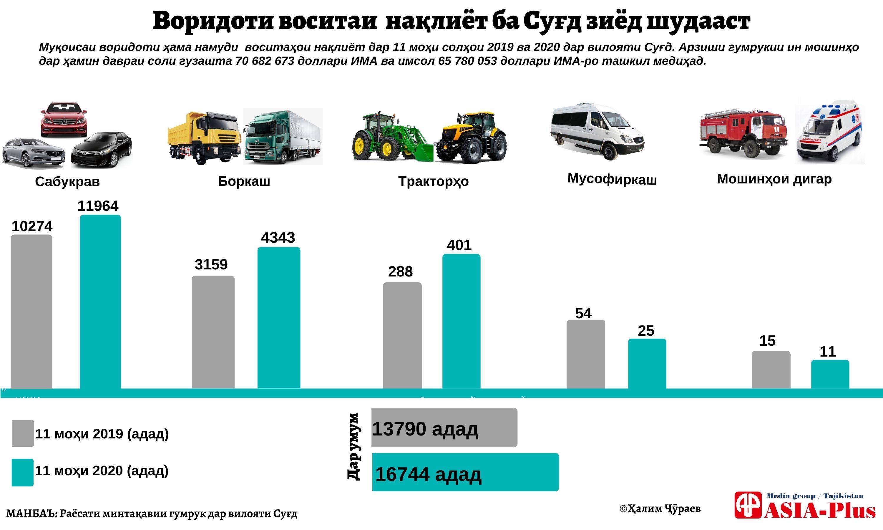 Манбаъ афзуд, дар маҷмӯъ давоми ёздаҳ моҳи имсол 11 ҳазору 964 адад сабукрав, 4 ҳазору 343 адад боркаш, 401 адад трактор, 25 адад мусофиркаш ва 11 адад мошинҳои махсус ба вилояти Суғд ворид шудааст. Ҳарчанд воридоти мошин назар ба як соли пеш зиёд аст, арзиши гумрукӣ аз воридот бамаротиб кам шудааст.