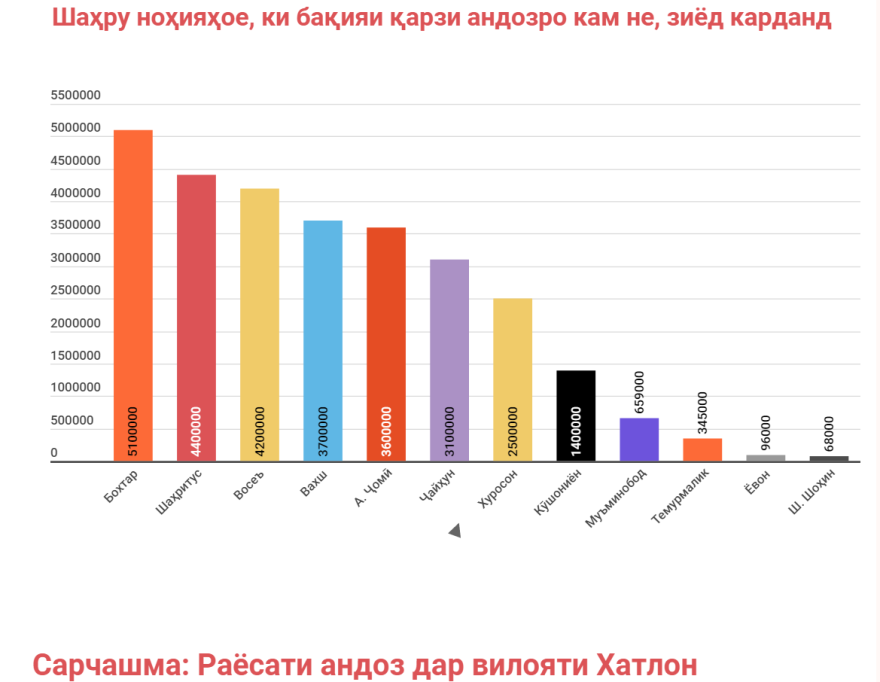 Шаҳру ноҳияҳое, ки бақияи қарзи андозро зиёд карданд, инҳо мебошанд: Бохтар (5,1 миллион сомонӣ), Кӯшониён (1,4 миллион сомонӣ), Вахш (3,7 миллион сомонӣ), Хуросон (2,5 миллион сомонӣ), Абдураҳмони Ҷомӣ (3,6 миллион сомонӣ), Ҷайҳун (3,1 миллион сомонӣ), Шаҳритӯс (4,4 миллион сомонӣ), Ёвон (96 ҳазор сомонӣ), Муъминобод (659 ҳазор сомонӣ), Восеъ (4,2 миллион сомонӣ), Темурмалик (345 ҳазор сомонӣ) ва Шамсиддин Шоҳин (68 ҳазор сомонӣ).