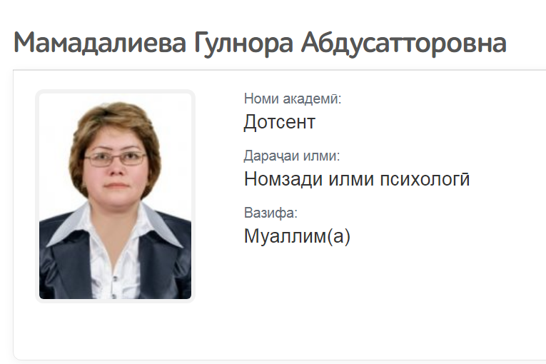 Пойгоҳи таҳқиқотии “Диссернет” боз як олими дигари тоҷик Мамадалиева Гулнора Абдусатторовна, дотсенти кафедраи равоншиносии умумии Донишгоҳи давлатии Хуҷанд ба номи академик Бобоҷон Ғафуровро ба асардуздӣ муттаҳам кард. Ин маълумотро пойгоҳ рӯзи 18-уми декабр нашр кардааст.
