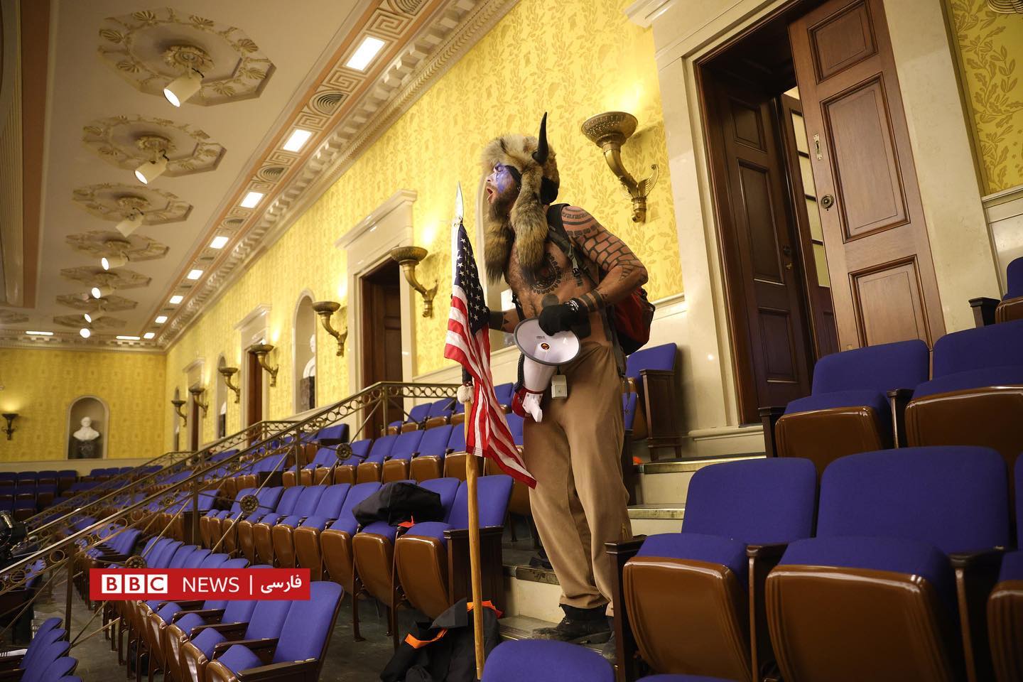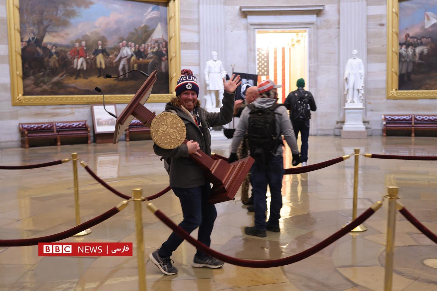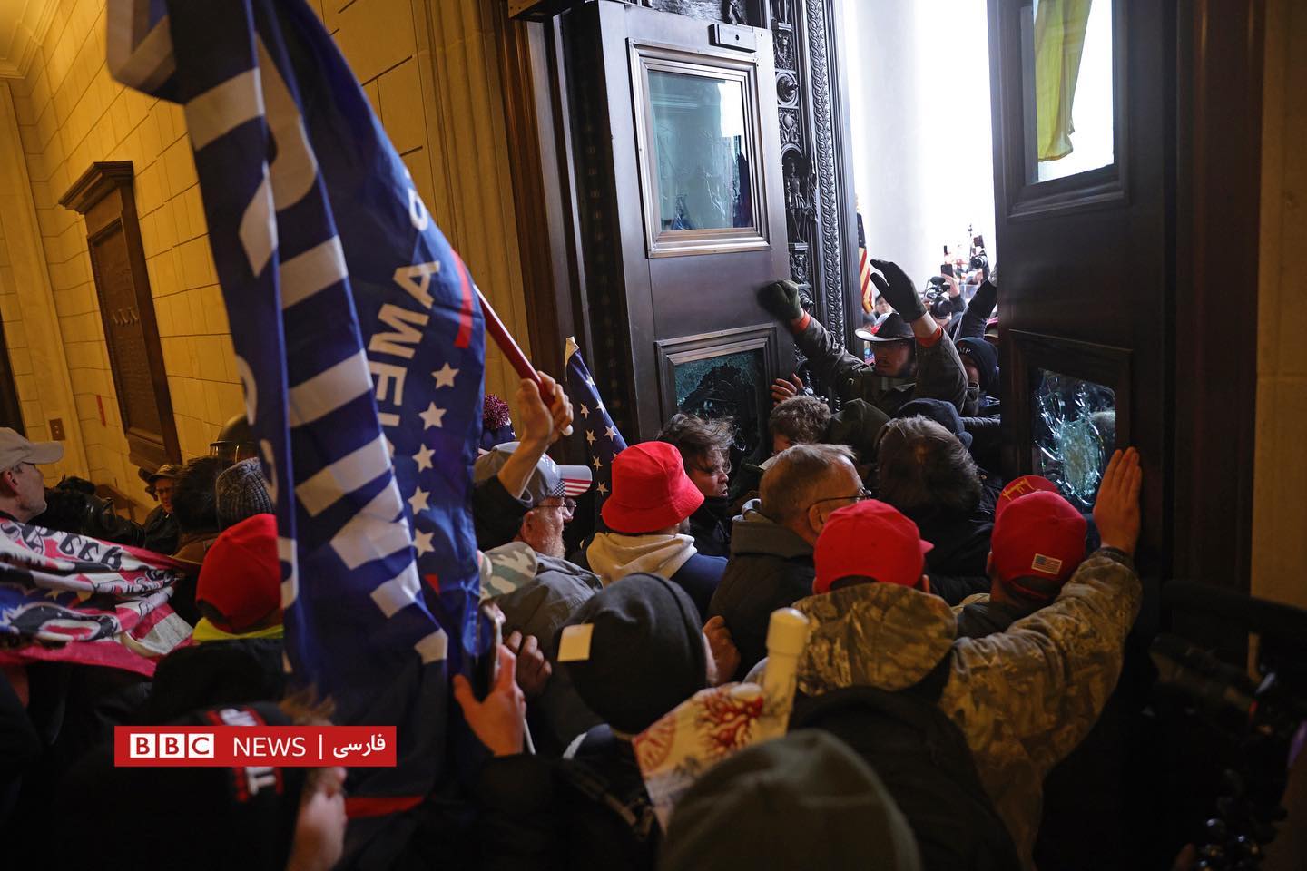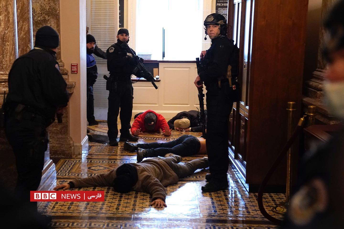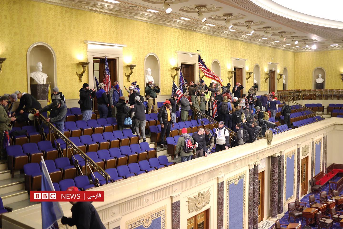 Дида мешавад, ки чӣ гуна тарафдорони Трамп дар дохили бинои Капитол мегарданд ва ба толори Сенат ворид мешаванд. Дар як аксе дида мешавад, ки маъмурони амниятӣ аслиҳаи худро берун кашидаанд ва вакилон зери курсиҳо пинҳон шудаанд. Дар дохили бино як зане аз тири туфанг захмӣ шудааст.