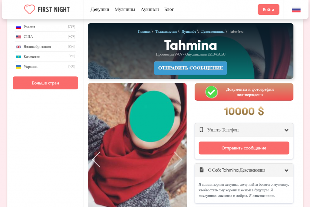 Дар ин сомона воқеан ҳам саҳифаи нафаре аз Тоҷикистон, ки номашро Таҳмина (Tahmina) сабт кардаасту худро 23-сола гуфтааст, мавҷуд буда, бакораташро дар музоядаи байналмилалии онлайнӣ бо арзиши 10 ҳазор доллар ба фурӯш гузоштааст (бойгонӣ). Вале дар сомонаи «Шаби аввал» маълумот дар бораи ин тоҷикдухтар ҳанӯз 22-уми апрели соли 2020 пайдо шуда, рӯзҳои охир расонаӣ гардид. Инчунин, дар саҳифаи номбурда, ки танҳо 3 акс ҷой дода шуда, дар он қайд гаштааст, ки ҳуҷҷату аксҳои номбурда тасдиқ шудаанд, мо хостем, аксҳои мазкурро мавриди санҷиш қарор диҳем.