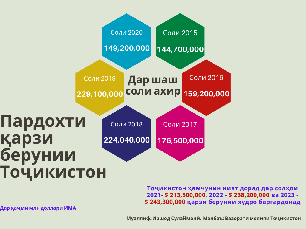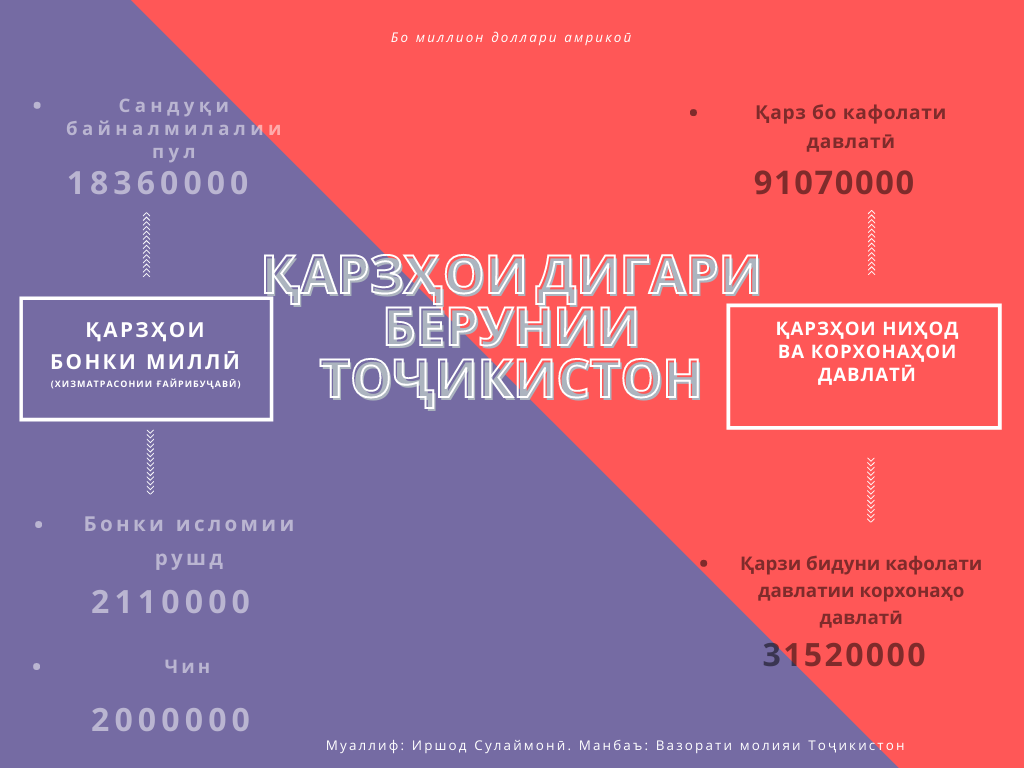Тоҷикистон ният дорад дар соли 2021 барои пардохти қарзи берунияш $453 млн пардохт кунад. Қарзи берунии Тоҷикистон дар соли гузашта асосан аз ҳисоби қарзи Сандуқи байналмилали пул ба маблағи $190 млн афзудааст. Қарздиҳандаи асосии Тоҷикистон Чин аст, ки $1,2 млрд қарзи берунии кишвари мо ба давлат рост меояд. Қарздорӣ ҳамчунин аз ҳисоби ба фурӯш баровардани вомбаргҳои давлатӣ (евробондҳо) дар бозорҳои молии ҷаҳон $500 млн. долларо ташкил медиҳад.