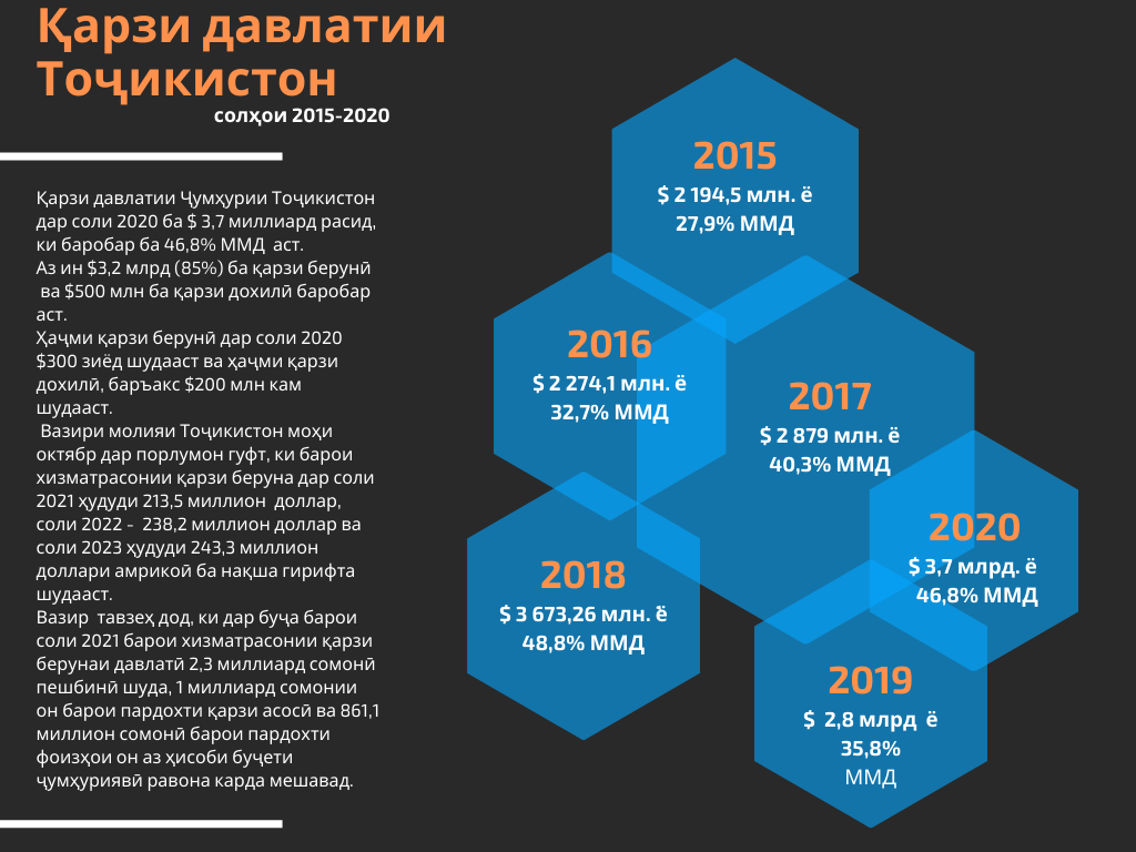 То 1-уми январи соли 2021 Қарзи давлатии Тоҷикистон ба $3,7 млрд. расид, ки, баробар 46,8% ММД-и кишвар аст. Ин дар ҳолест, ки мувофиқи “Стратегияи идоракунии қарзи давлатии Ҷумҳурии Тоҷикистон барои солҳои 2018-2020” ҳаҷми умумии қарзи давлатӣ нисбат ба маҷмуи маҳсулоти дохилӣ набояд аз 60% боло бошад. Дар таркиби қарзи давлатии Тоҷикистон $3,2 млрд (85%) ба қарзи берунӣ ва $500 млн ба қарзи дохилӣ баробар аст. Ҳаҷми қарзи берунӣ дар соли 2020 $300 зиёд шудааст ва ҳаҷми қарзи дохилӣ, баръакс $200 млн кам шудааст.
