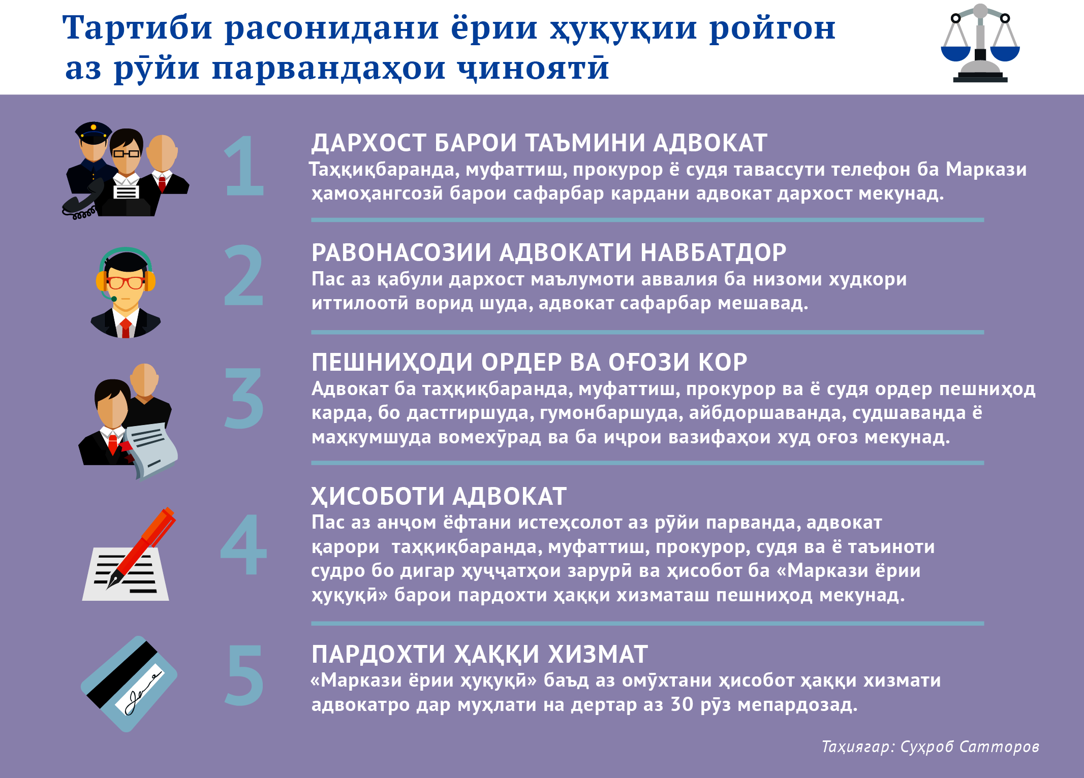 Раиси мақоми минтақавии Иттифоқи адвокатҳои Ҷумҳурии Тоҷикистон дар вилояти Хатлон Алишер Ҳайдаров мегӯяд: “Мо дар шӯрои худ рӯйхати яксолаи навбатдории адвокатҳоро муайян карда, ба Муассисаи давлатии “Маркази ёрии ҳуқуқӣ” фиристодем. Онҳо аллакай медонанд, дар кадом шаҳру ноҳия кӣ ва кай навбатдор аст. Вақте дархост барои иштироки адвокатҳо аз ҷониби мақомотҳои таҳқиқ, тафтиши пешакӣ ё суд ба маркази ҳамоҳангсозии муассисаи мазкур ворид мешавад, онҳо фавран таъмин мекунанд. Аз ҳамин лиҳоз, таъмини саривақтӣ ва бетаъхири адвокат ба роҳ монда шуд”.