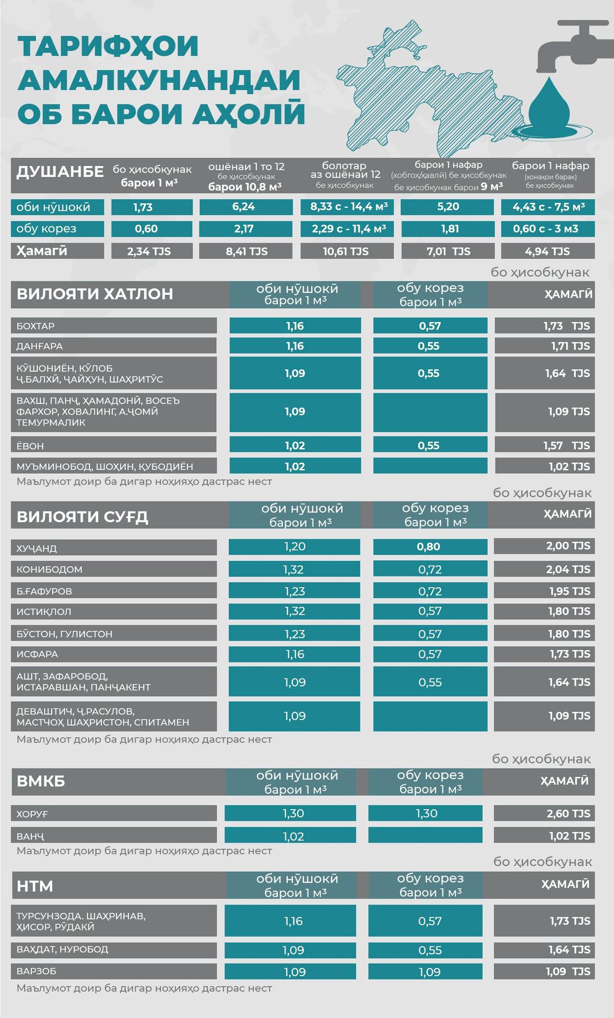 Тавре дар КВД “Хоҷагии манзилию коммуналӣ” маълумот доданд, тарифҳо барои ҳар кадоме аз шаҳру навоҳӣ фарқ доранд.