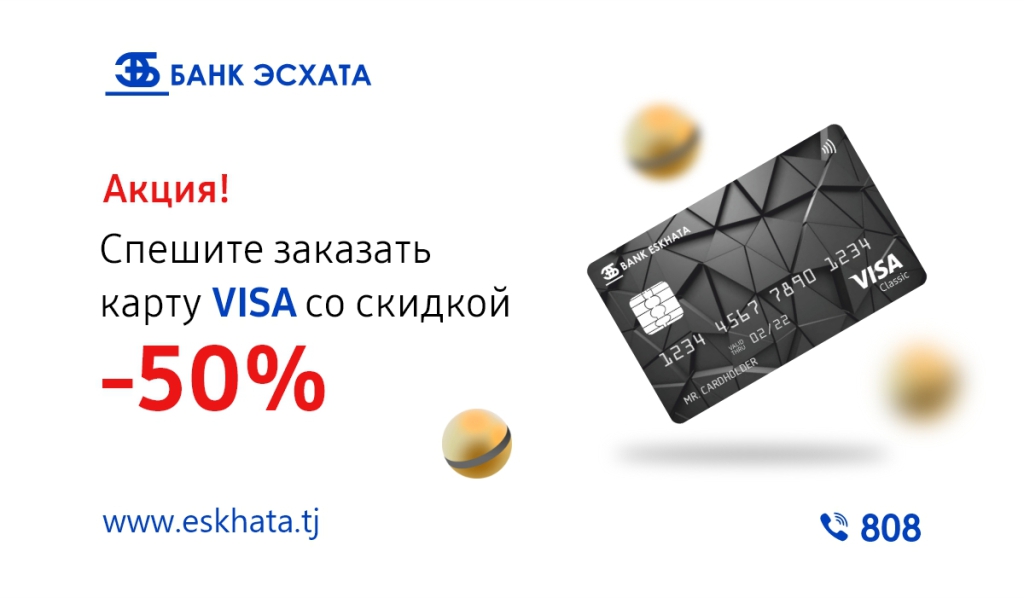 Ва боз ҳам иқдоми нав! Шитобед, ки кортҳои VISA Classic -ро бо тахфифи 50% ва бо нархи ҳамагӣ 50 сомонӣ фармоиш диҳед!