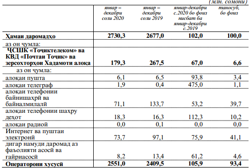 Даромади воҳидҳои оператори миллии алоқаи “Тоҷиктелеком”, КВД “Почтаи Тоҷик” ва воҳидҳои Хадамоти алоқа баръакс, 88 млн сомонӣ – аз 268 млн сомонӣ дар соли 2019 то ба 180 млн сомонӣ дар соли 2020 кам шуд.