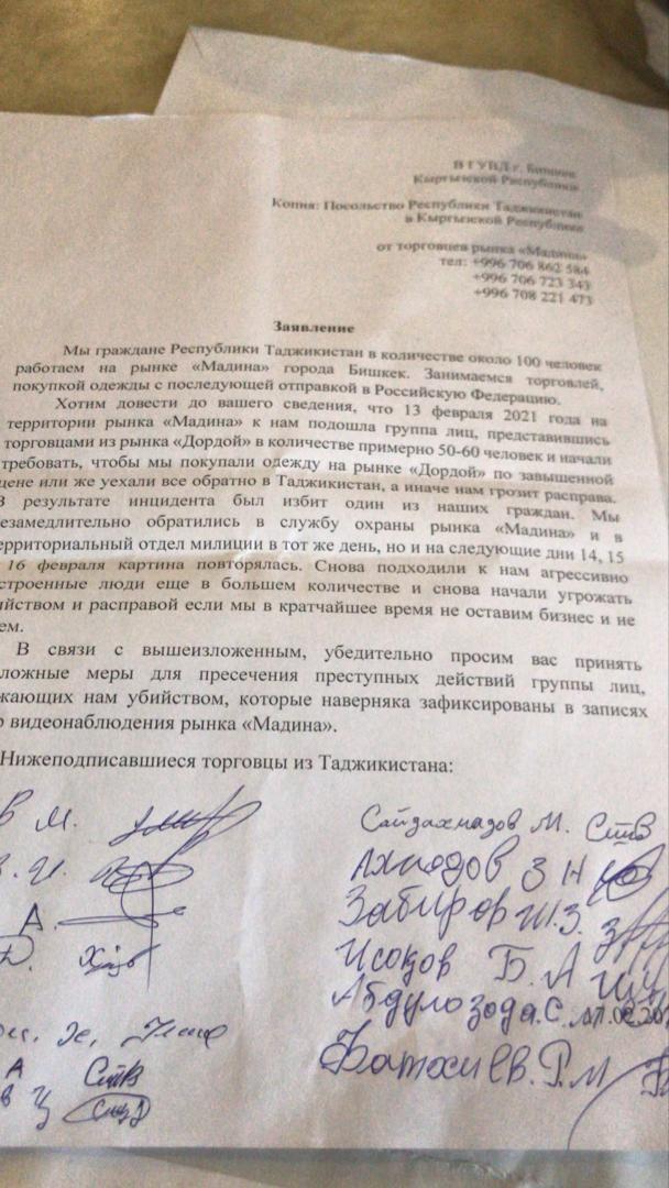 “Аз 13 феврал савдогарони бозори “Дордой” ба мо занг зада, талаб карданд, ки аз онҳо сарулибос харем ё қаламрави Қирғизистонро тарк кунем, – гуфт ӯ. – Онҳо ҳамчунин якчанд соҳибкорони моро лату кӯб карда, дар натиҷа онҳо қаламрави Қирғизистонро тарк карданд. Ба дигар соҳибкорон куштанро таҳдид мекунанд”.