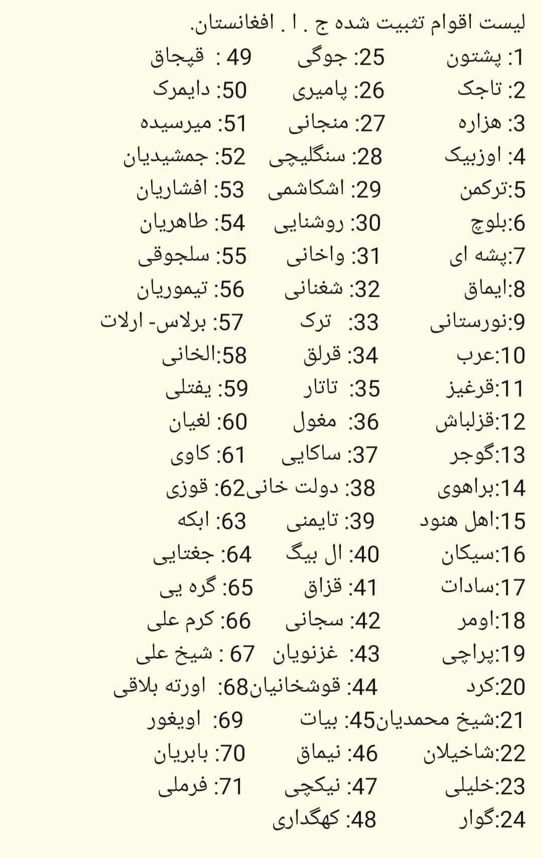 Аз ҷумла дар ин рӯйхат тоҷиконе чун помириҳо, шуғнониҳо, вахониҳо, рӯшониҳо, санглечиҳо, мунҷониҳо, ишкошимиҳо, ҷамшедиён, тоҳириён ва ғайр қавмҳои ҷудогона аз тоҷик ном бурда шудаанд. Ин рӯйхати нав дар ҳоле аст, ки номи қавмҳои Афғонистон дар моддаи 4-и Қонуни Асосии ин кишвар 14-то зикр шудаанд.