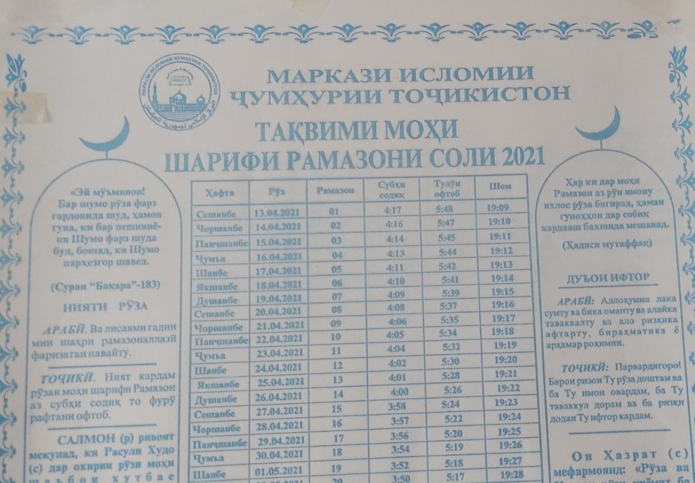 Шӯрои уламои Маркази ислоии Тоҷикистон 13-уми апрелро рӯзи оғози моҳи шарифи Рамазон эълон кард. Ба ҳамин тартиб шаби 12-уми апрел шаби аввали намози таровеҳ дар Тоҷикистон мебошад. Шӯрои уламо ин рӯзро дар асоси хулосаи пешниҳодкардаи Пажӯҳишгоҳи астрофизикаи Академияи миллии илмҳои Тоҷикистон эълон кардааст.